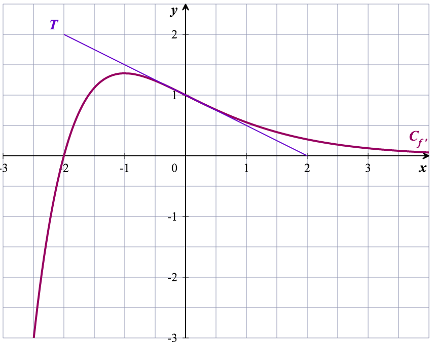 La droite T est tangente à la courbe Cf' au point d'abscisse 0.