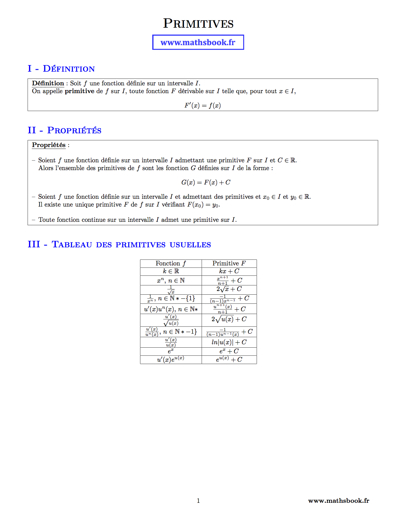 Téléchargez la fiche de révision de ce cours de maths Primitives au format PDF à imprimer pour en avoir une version papier et pouvoir réviser vos propriétés partout.